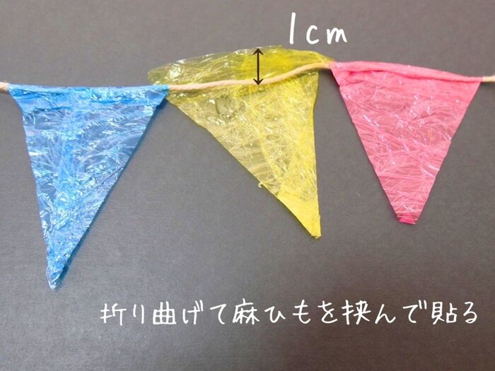 三角形の底辺から1cmのところに麻ひもを挟んだら、折り曲げて貼り付けます。はみ出た部分も脇から折り曲げて貼り付けます。