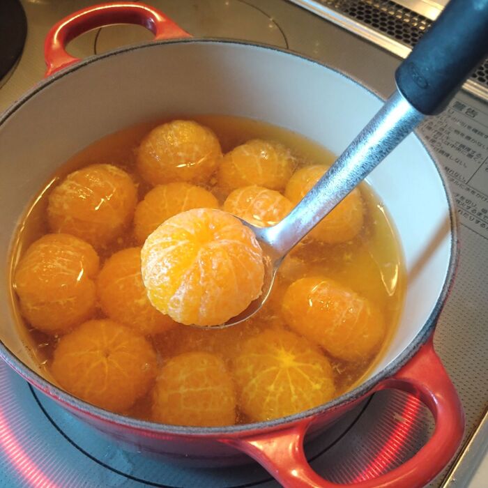 ボコボコ湧いたらみかんをイッキに全部入れます。