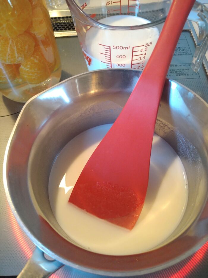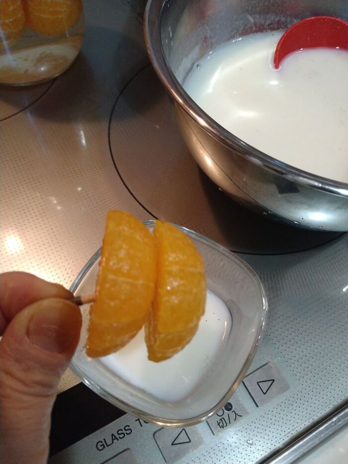 この時、ミカンのカットした表面に牛乳寒がかからないように浮かせるのが、ポイントです!