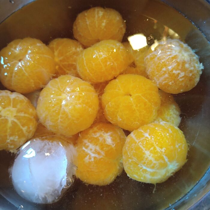 2~3分したらお玉でみかんをすくい冷水のボールに取ります。