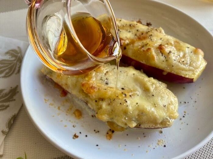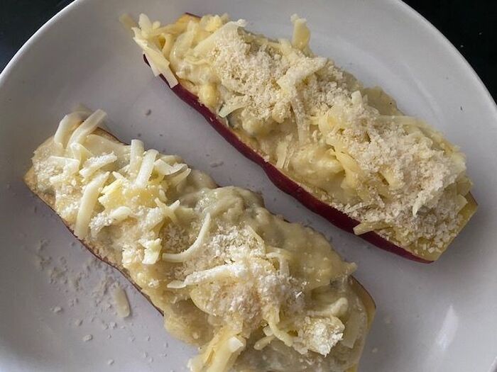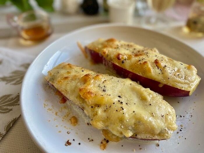 さつまいもに詰めシュレットチーズとパルミジャーノ(分量外)少々をふり