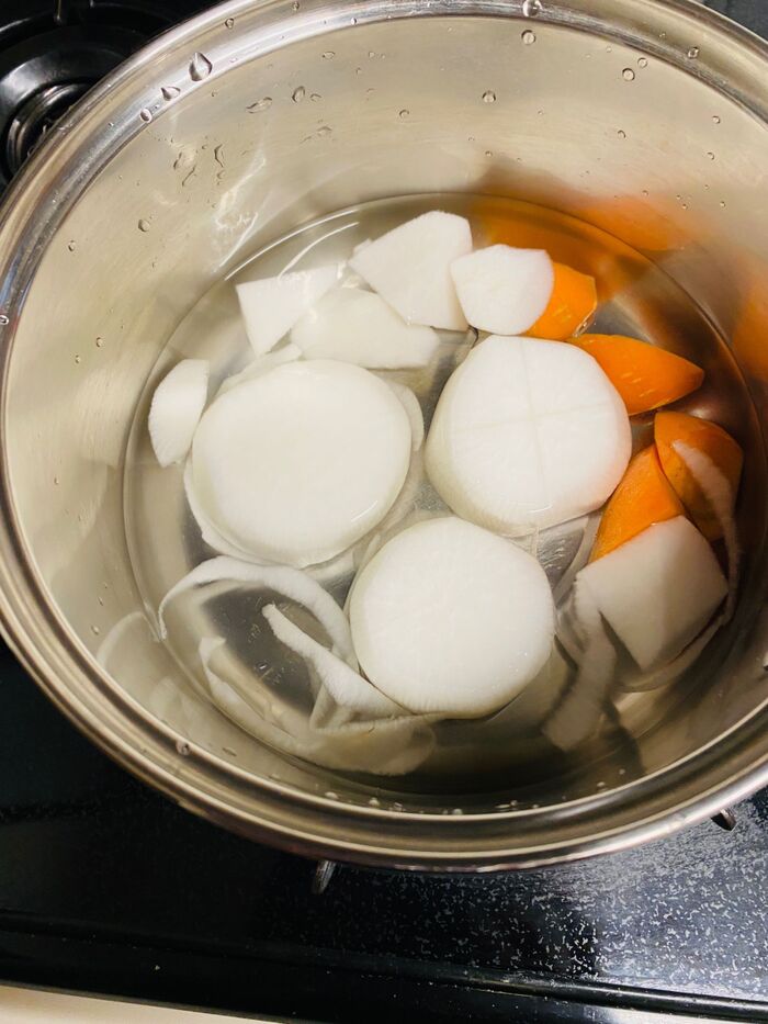 鍋に材料がかぶるくらいの水を入れて、大根と一緒に火にかけます。