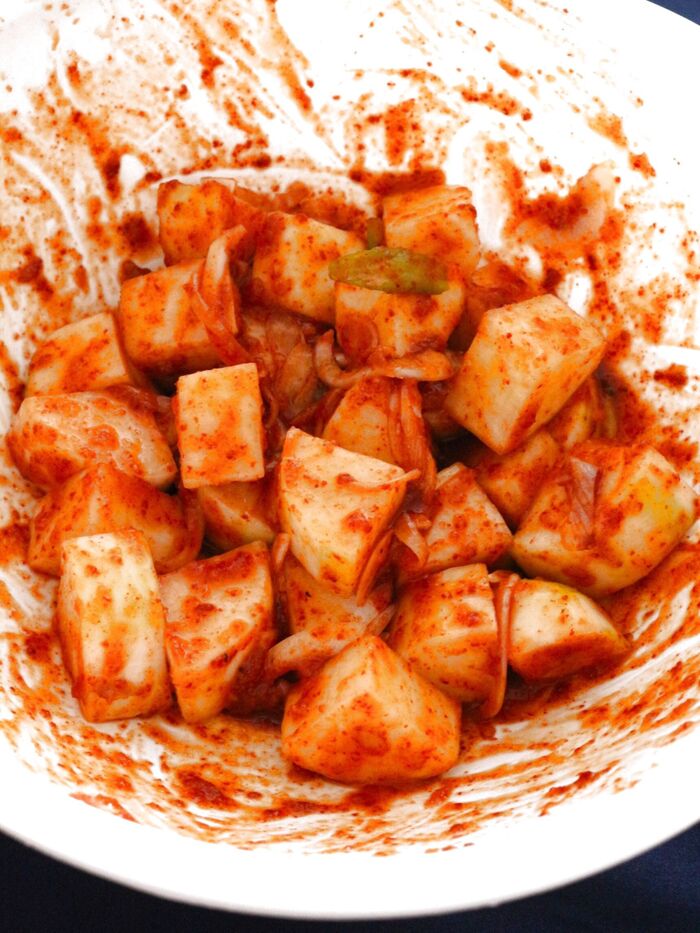 ①大根を輪切りにして4等分に切り、塩漬けにし(1時間位)、2回水洗いしてから軽く水気を切る。