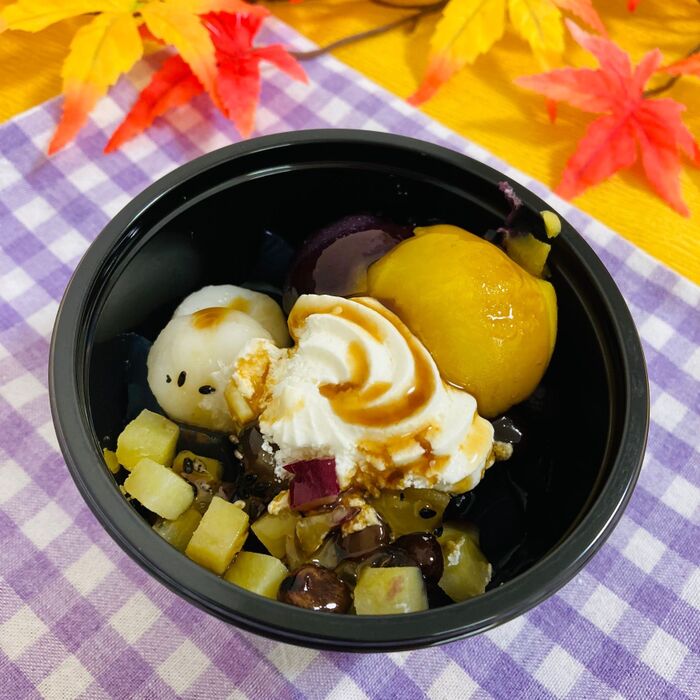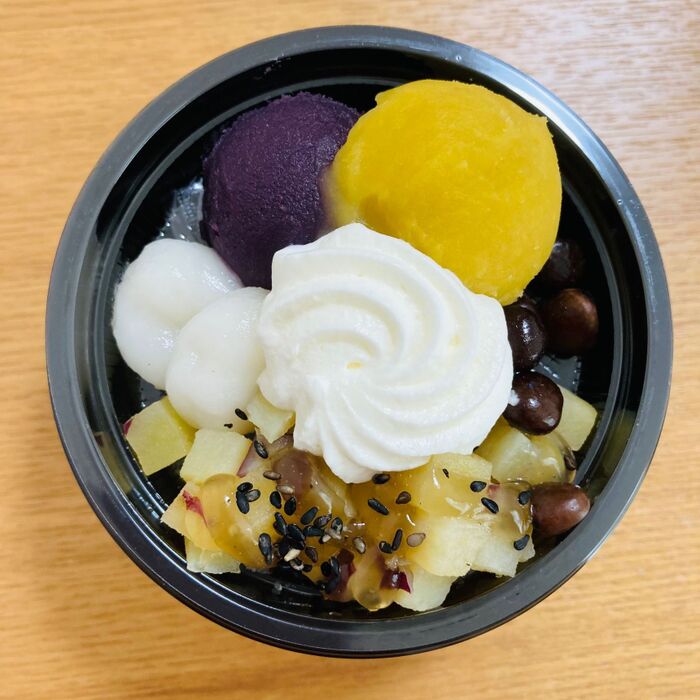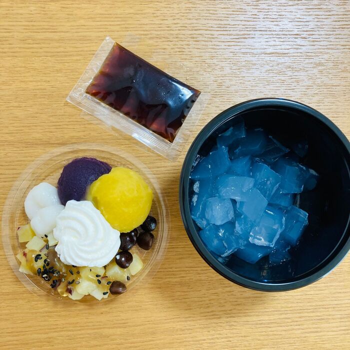 あんこ、芋あん、角切りさつまいも(たれがかかっています)、白玉、生クリーム、豆が上部に、下には寒天、黒蜜の入った小袋が入っていました。