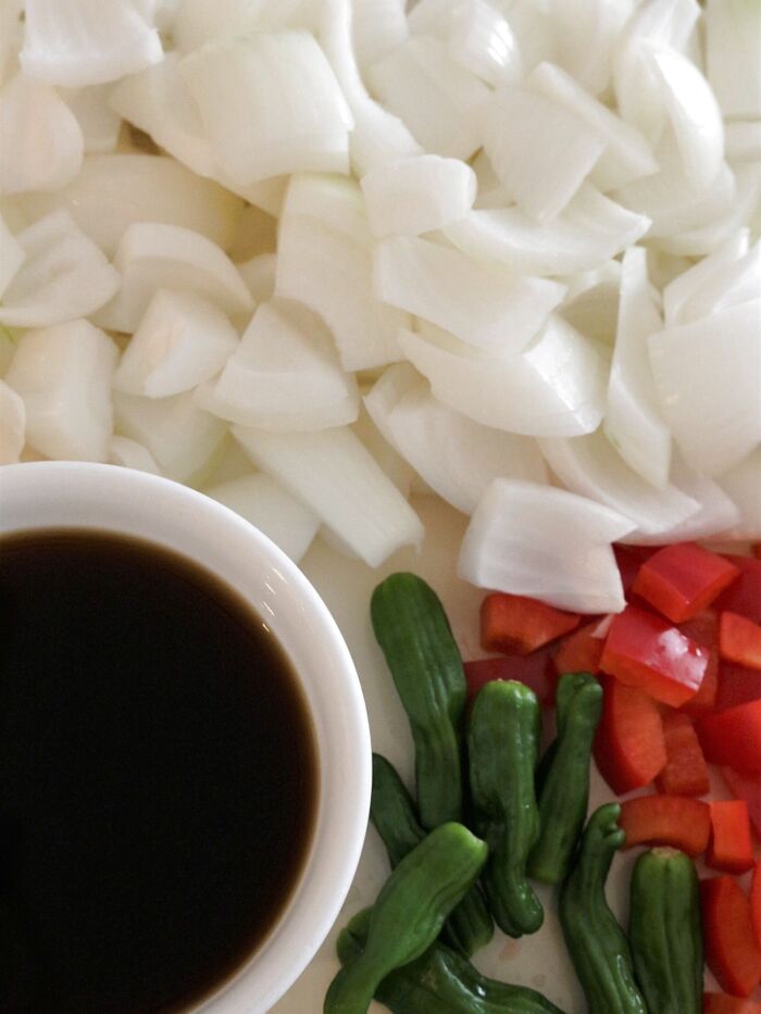 ①玉ねぎは一口大に、赤パプリカは1cmの大きさに、しし唐辛子は2ヵ所に串で穴を開ける。