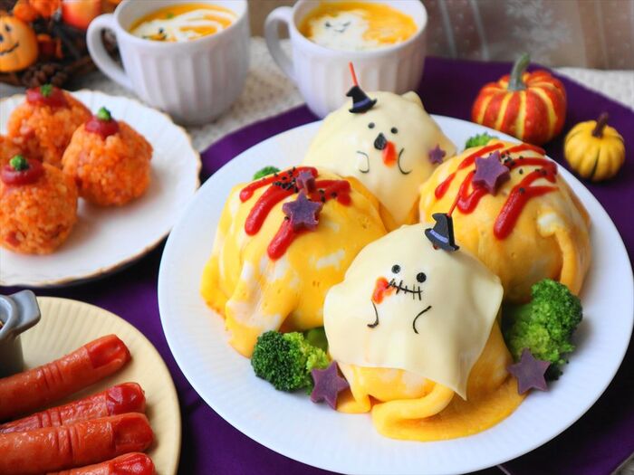 ※薄焼き卵で包むときに、おばけの動きを出したくて、あえてきっちり包まず、お皿に乗せるときに薄焼き卵にひだをつけて仕上げました。キレイに丸く包みたい場合には、薄焼き卵に切れ目を入れてから包み、ラップでしっかり丸めて落ち着かせると、まん丸に成形できます。