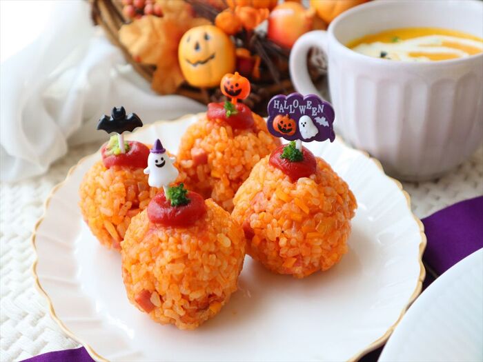 ケチャップライスが余ったら…小さいまん丸おにぎりにして、ハロウィンピックを刺すだけでもいいですよね。