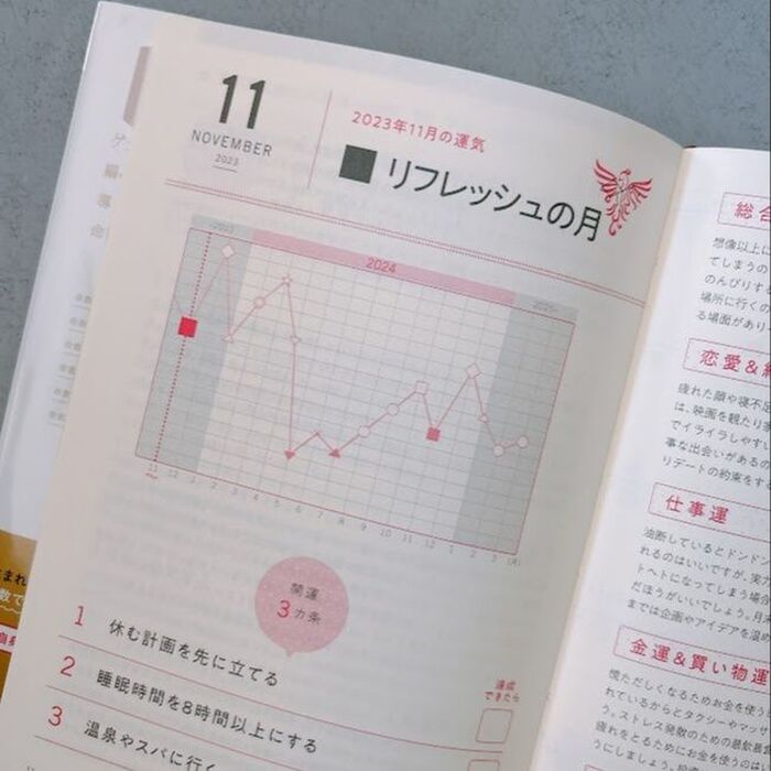 マンスリースケジュールは毎月開運3か条と、日々の運気が乗っているのでこれまた便利!行動に迷ったらヒントにできます。
