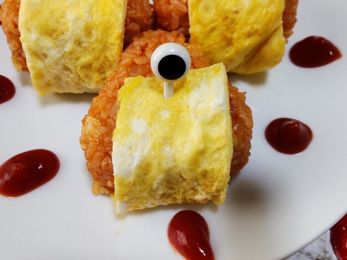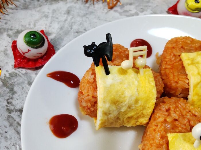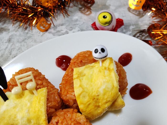 ⑤チキンライスおむすびに、②の卵を下から両面を挟んでハロウィンピックを挿して固定します。