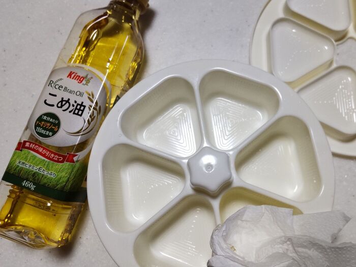 ③おむすびが同時に6個できちゃう、おにぎりメーカーの型を使います。離れやすくするように、ご飯が触れる部分に食用油をつけておきます。