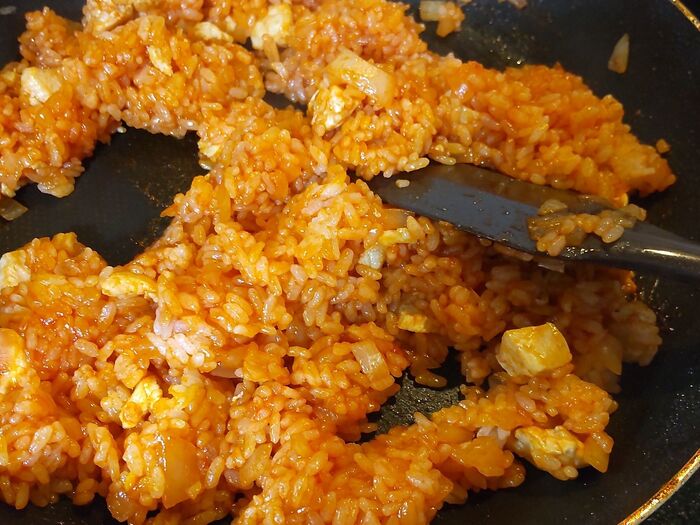 油を熱したフライパンに、玉葱と鶏肉を入れ、塩胡椒して炒め、ご飯を入れて、ケチャップも色がケチャップ色に染まる位加えて、均一にケチャップが行き渡るように混ぜながら炒めます。