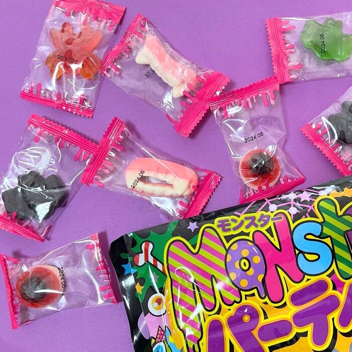 コウモリやスパイダー、目玉、ドラキュラの歯がグミになっていてキモかわ?おもしろいです。