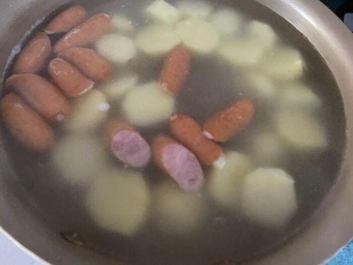 じゃがいもは皮をむき一口大の大きさに切り、沸騰したお湯で5〜6分茹でる。茹で終わりの30秒前に半分に切ったウィンナーを入れ一緒にザルにとる。