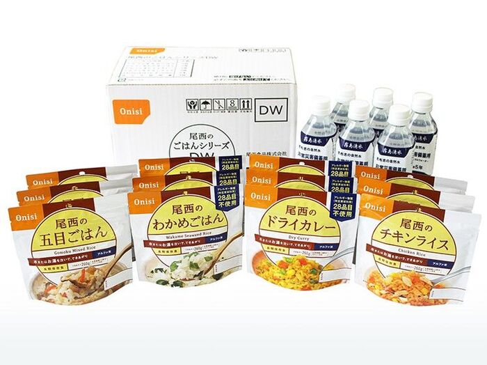 尾西の「アルファ米ごはんシリーズ」は、【白飯・五目ごはん・アレルギー対応五目ごはん・わかめごはん・きのこごはん・たけのこごはん・山菜おこわ・松茸ごはん・赤飯・ドライカレー・チキンライス・えびピラフ】の全12種類。