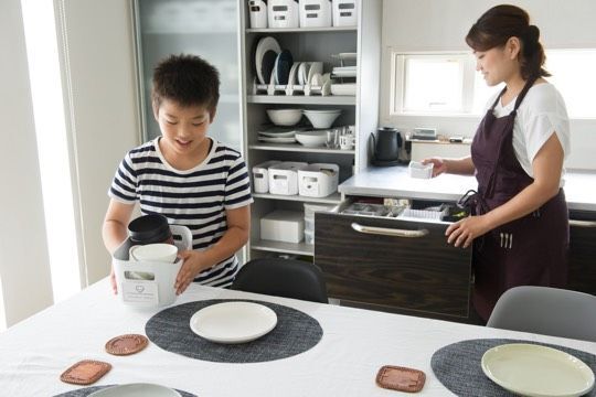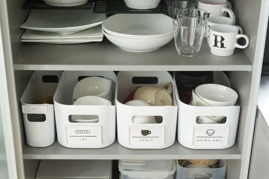 小堀家では食事の準備で食器を出すのは子どもたちの役目。茶碗やお椀など、使うアイテムを整理バスケットごと取り出して食卓に並べています。「ラベリングで見やすいから、子どもたちも私の手助けがなくても、自分で取り出して食卓に並べてくれます」