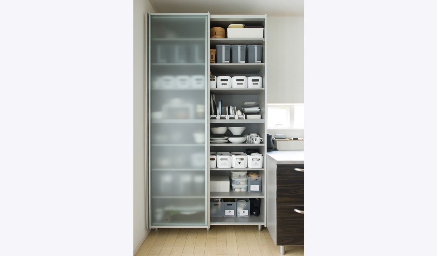 食器類はキッチンの天井まで届く大容量の棚にすべて収納しています。