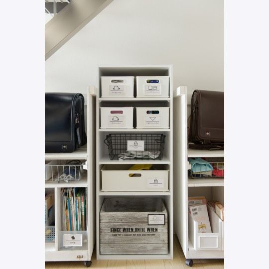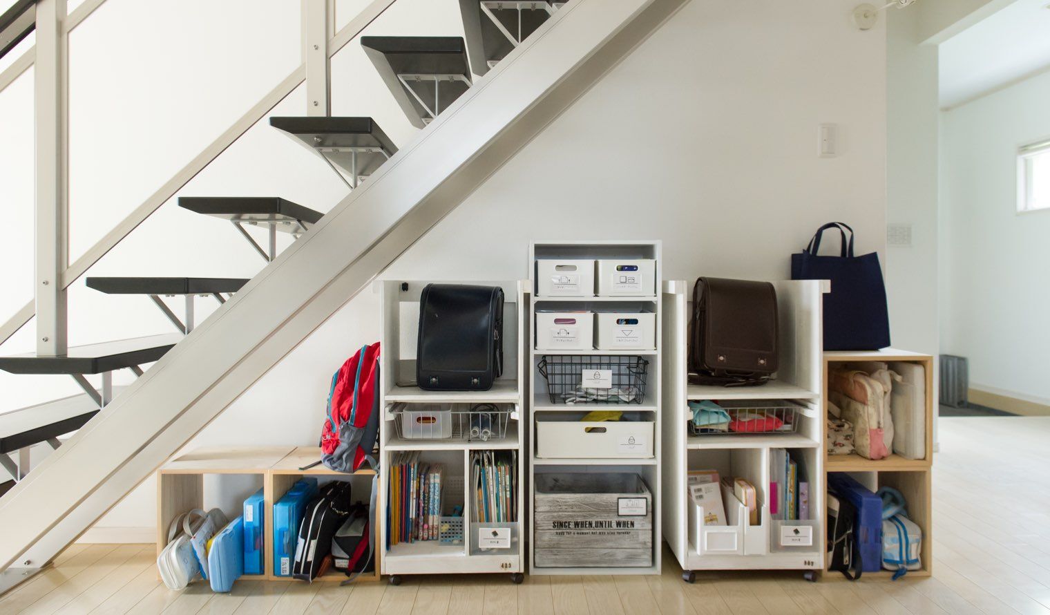 さらに、小堀家では、リビングと玄関に近い階段の下のデッドスペースを利用して、子どもたちの学用品をまとめて収納しています。中央にニトリの「カラーボックス」を置き、その右側に長女、左側に長男、それぞれの学校や塾の道具を置いています。