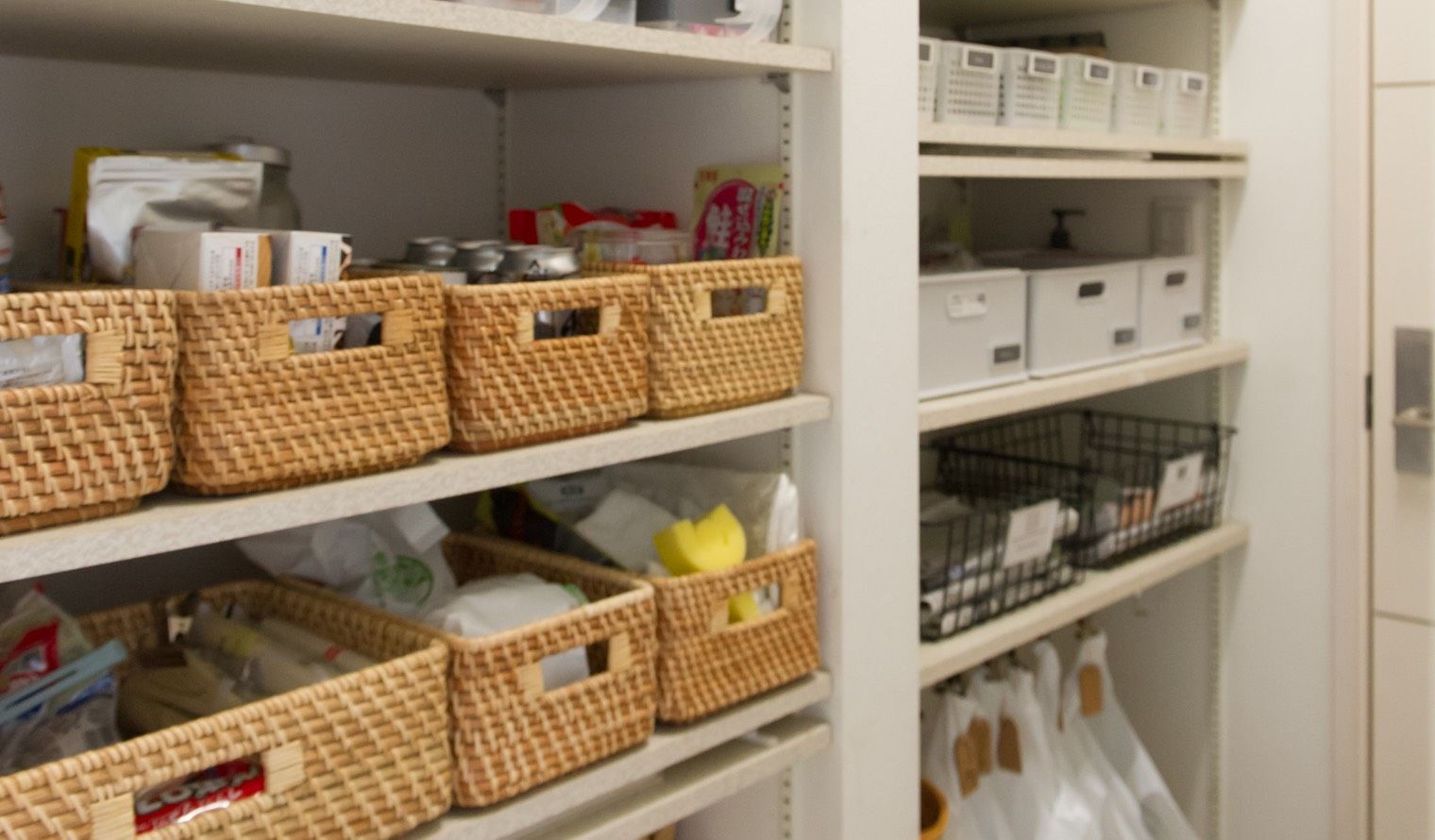 小堀家でも、このルールを守っています。中でも食材のストックを中心に、調理家電、掃除用具、資源ごみまで、多種多様なモノを収納するパントリーを例に、しまい方の基本ルールを見せてもらいました。