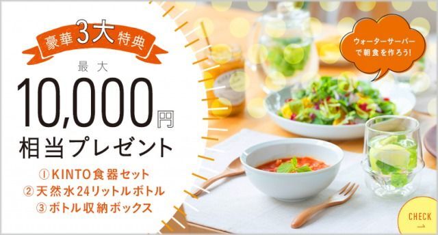 現在は、7月31日までのキャンペーンとして、新規契約の人に限り、抽選で「KINTO食器セット」、新規契約の方全員に初月の天然水ボトル2本、そして水ボトルがすっぽりと収まる「座れる収納ボックス」のプレゼントが付いた3大特典キャンペーンを実施中。