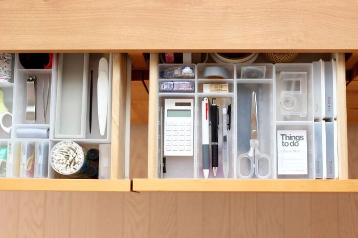 改善方法は、 “このショップでしか買えない”というニッチな物を使うよりも、無印良品や100均などで扱っている物を使うことが多いです。そのほうが自分も試しやすいし、みなさんもハードルが下がってやってみようかなって思ってもらえるので。例えば最近だと、小1の娘がヘアゴムを付けたがるようになって、ヘアゴムの収納を見直しました。今まで、子ども部屋のおもちゃのドレッサーの中に入っていたんですが、ごちゃごちゃで選びにくかったんです。子どもが自分で選びやすいようにするにはどうしたらいいかを考えて、もともと文房具の収納などで愛用している無印良品の仕切り付きのトレーを使ってみました。