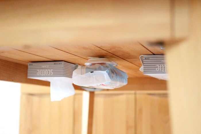 ダイニングテーブルの裏側に強力マグネットでテュッシュ類を浮かして収納しているアイデア。