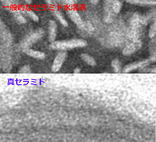写真上が一般的なセラミド水溶液。バラバラに分散していてラメラ構造を保っていません。写真下が「真セラミド」。ラメラ構造を維持しています。
