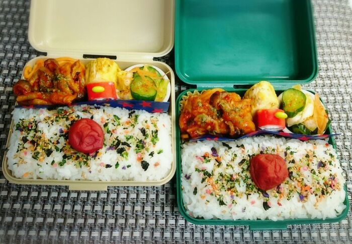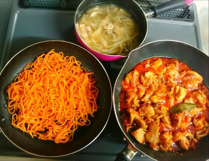 作っているプロセス写真は基本的に撮影しない、からあげビールさんですが、今回は特別にコンロフル回転の様子を撮影してもらいました。この日はチキンときのこのトマト煮込み、付け合わせにパスタ、新玉とベーコンのコンソメスープを同時進行で作っています。付け合わせのもう一品は、レンジでチンしたブロッコリーのペッパーソルト和え。ほか、野菜サラダと作りおきの浅漬けも食卓に並びました。所要時間30分で晩ごはんづくりの完成!パスタとチキンの量が多いのは、翌日のお弁当(2人分)の取り置きも入っているからなのだそう。トップ画面の写真がそのお弁当です。