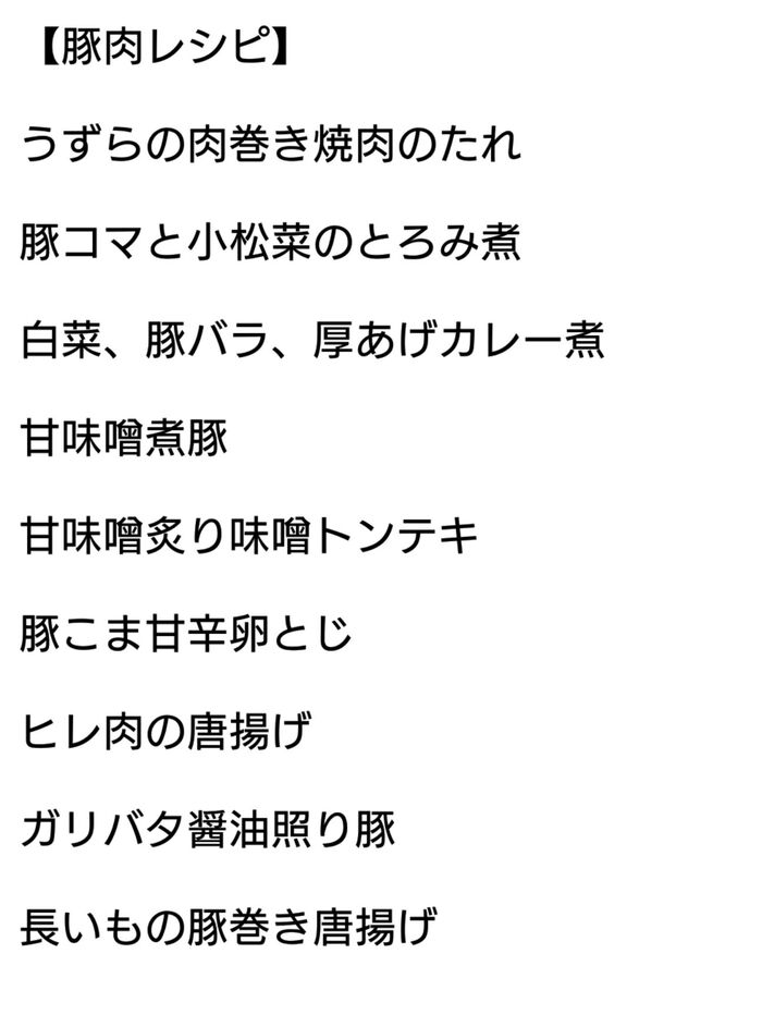 ↓メモアプリにメモしているレシピアイデアの例。こちらは豚肉レシピ編。素材ごとにまとめているそうです。
