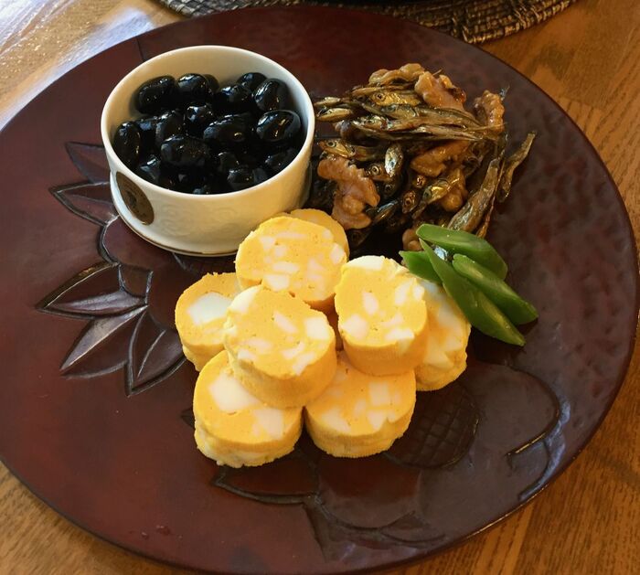 おせちは毎年お姑さんが用意してくれるそうですが、ここ4年位はお子さんたちと一緒に1〜2品を作って持っていくようにしているのだとか、この時は、子どもたちが田作りと黒豆を作りたい!と言ったので、一緒につくりました。岩石卵は増田さん作。