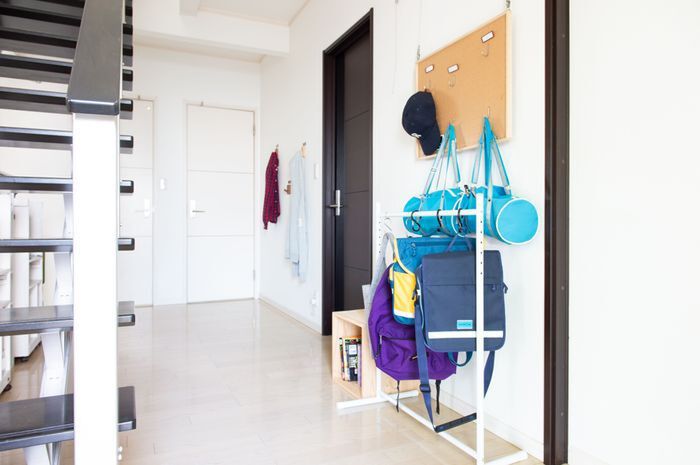 玄関の様子。帽子やアウター、カバンなど、出かける前にサッと取り出せて、帰宅するとすぐ定位置に戻せるように工夫しています。