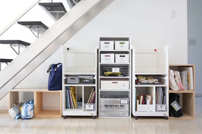 玄関近く、階段下に学校の荷物をまとめて収納できるスペースをつくりました。普段の学校準備はここで整います。