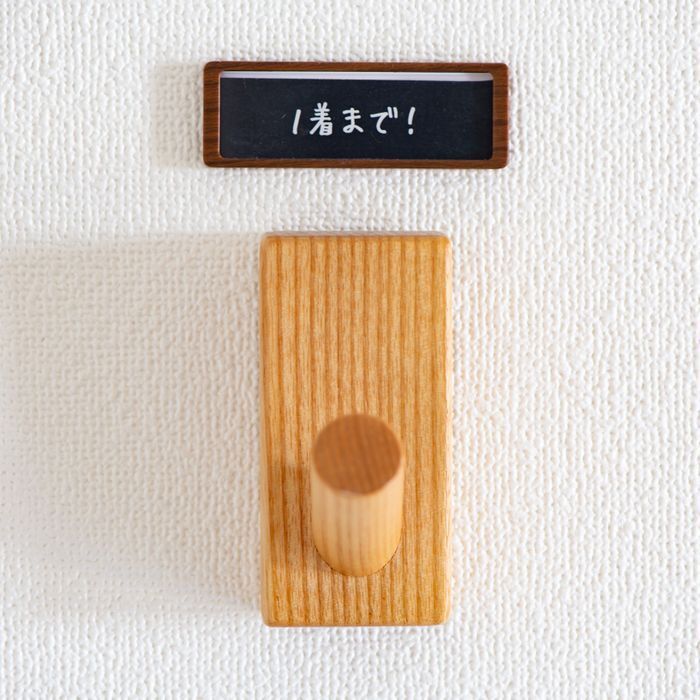 例えば、アウターの収納。外から帰ってきたときに掛けられるように、廊下にフックを付けているのですが、それぞれの身長に合わせて高さを変えています。さらに、1つずつラベルを付けていて、毎日アウターを変える長女には「1着まで」、チャレンジ精神たっぷりの長男には「絶対に落ちない服」、慌てがちな次男には「ていねいにかけてね」と、それぞれに響くメッセージを添えています。