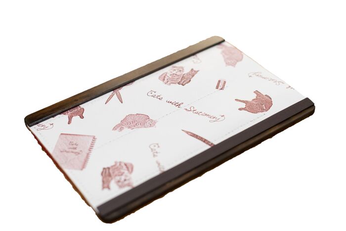 “かわいくて大人も使えるデザイン”を目指し、白地の本革に猫と文房具の柄がプリントされた、かっこよくもかわいらしいデザインに仕上がっています。