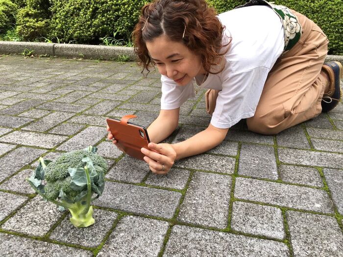 ブロッコリーが私です。ブロッコリーにしたのは、私の髪型がくるくるパーマで似ているし(笑)、年中手に入るし、おいしいし、見た目のパンチもある。ブログにのせる写真を公園で撮るときは、一人じゃ恥ずかしいから子どもと一緒に行って、「お願いだからお母さんの近くにいて!」って言ってました(笑)。子どもが幼稚園に行っている時間に一人で公園で撮影していたときは、ブロッコリーにヘアピンを付けてたら、通りがかった近所の人に「あら~、ブロッコリーがおしゃれしてるの?」って言われたことも(笑)。