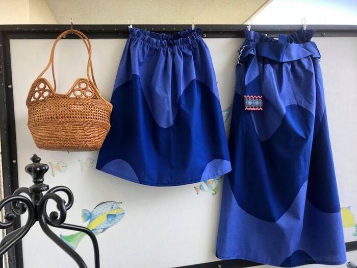 マリメッコの布地で娘とおそろいのスカートを制作。ベルトの端にはビンテージのリボンをあしらって。