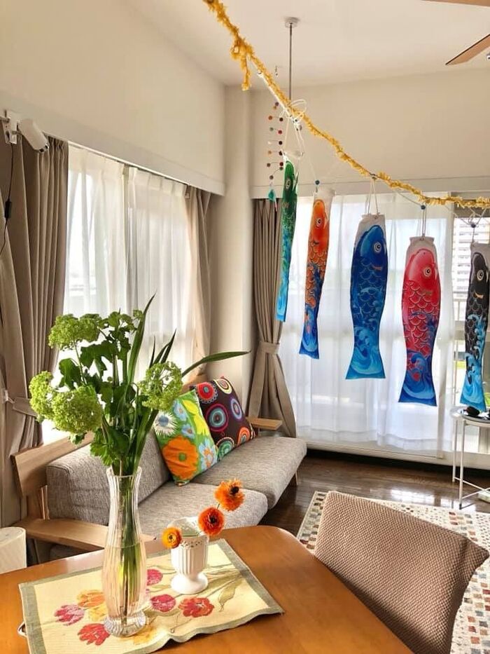 天井からぶら下げたこいのぼり。リビングはまるで文化祭のような雰囲気です。