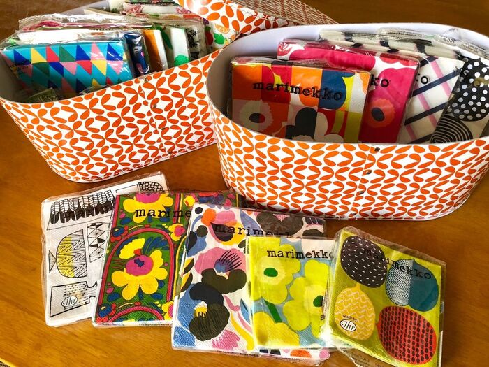 ペーパーナプキンもそう。めっちゃ好きで、めっちゃあります。大好きなマリメッコが手軽に取り入れられるのも嬉しくて、つい買ってしまう。使うのが追い付いていないです(笑)。