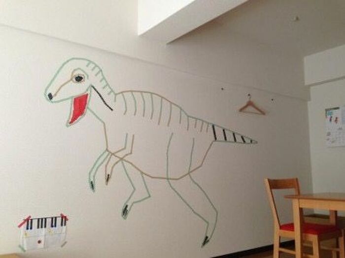 マスキングテープで壁に大きな恐竜を描いてみました。