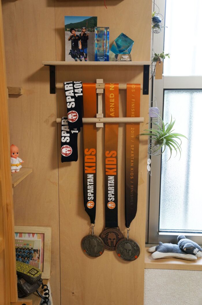 2人のお子さんが「スパルタンレース」に参加したときの写真とメダル。メダルをかけているバーはちゃこさんの手作り。