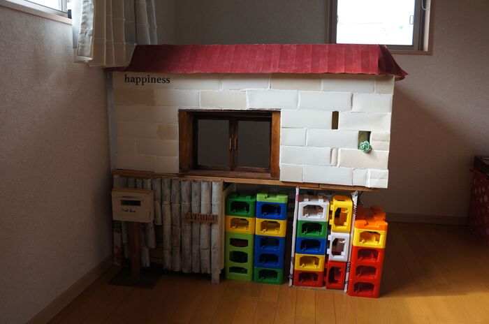 数年前に作った牛乳パックのおうち。最初はもっと大きかったものを少しずつ縮小し、そろそろ完全に片付けようかとも思いつつも、息子さんのお友達の小さい兄弟が来るとまだ遊ぶことも多く、残しているそうです。