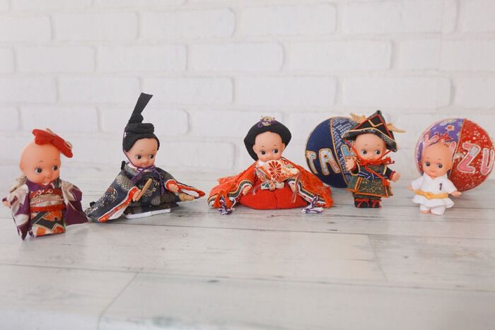 お子さんのために作った雛人形と五月人形。七五三に作った手毬と、空手と七五三キューピー。