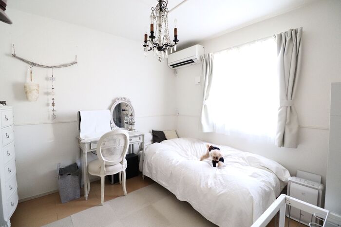 リビングとは全く違うテイストの寝室は、シャビーシック&アンティークがテーマ。
