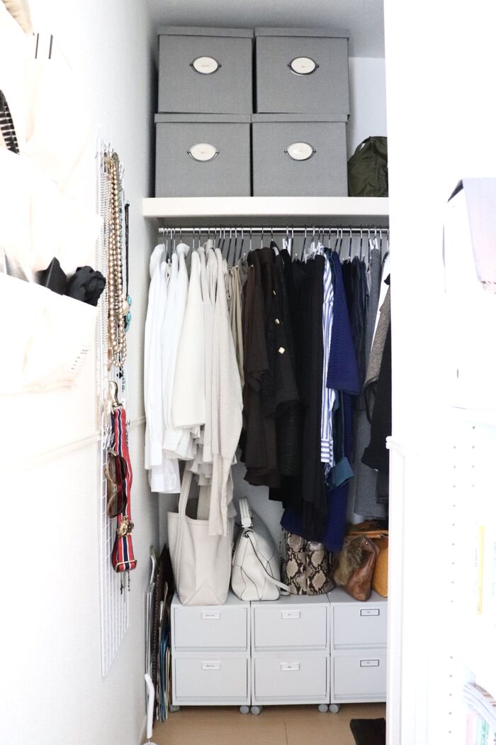 自宅のウォ―クインクローゼットの様子。扉がないので、特に目に入る部分は、ごちゃついて見えないように白色メインの洋服をかためててハンガーにかけ、色の氾濫を抑えています。