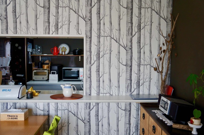 キッチンとダイニングの間にある壁の森のような壁紙もDIYで。部屋の中にいながらキャンプのようなイメージも。
