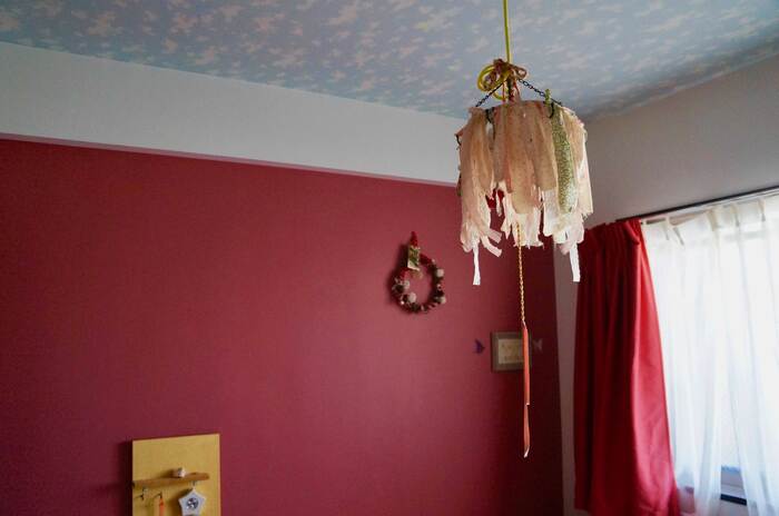 お嬢さんの部屋。手作りした照明と壁の色合いが個性的でシック!まるでパリのアパルトマンのようです。