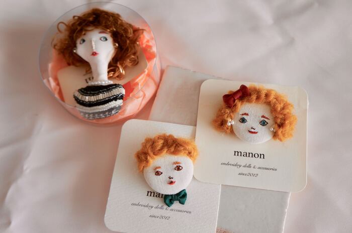 ドールのブローチ。細部の素材にもこだわりがたっぷりです。manonというブランド名で製作しています。