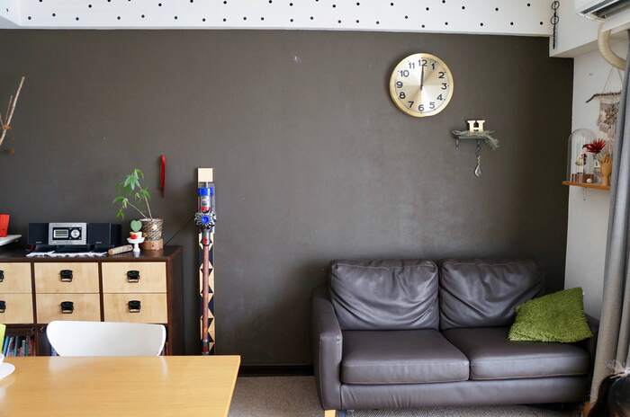 リビングダイニングの様子。チャコールグレーのペイントもご自身で。上部につけたドットが個性的です。