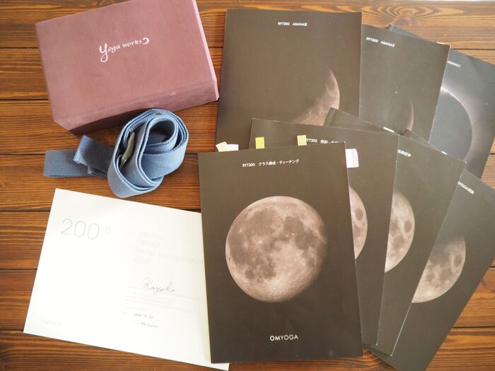 ヨガのテキスト、修了書、ヨガの時に使うプロップス(補助器具でベルトとブロック)