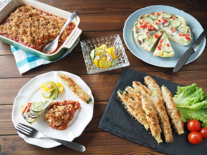 料理講座のメニュー例。ズッキーニレシピ:ラザニア、スペインオムレツ、2色のマリネ、マスタード風味の豚肉巻きとすべてにズッキーニを使った料理。ワインにも合うおもてなし料理です。