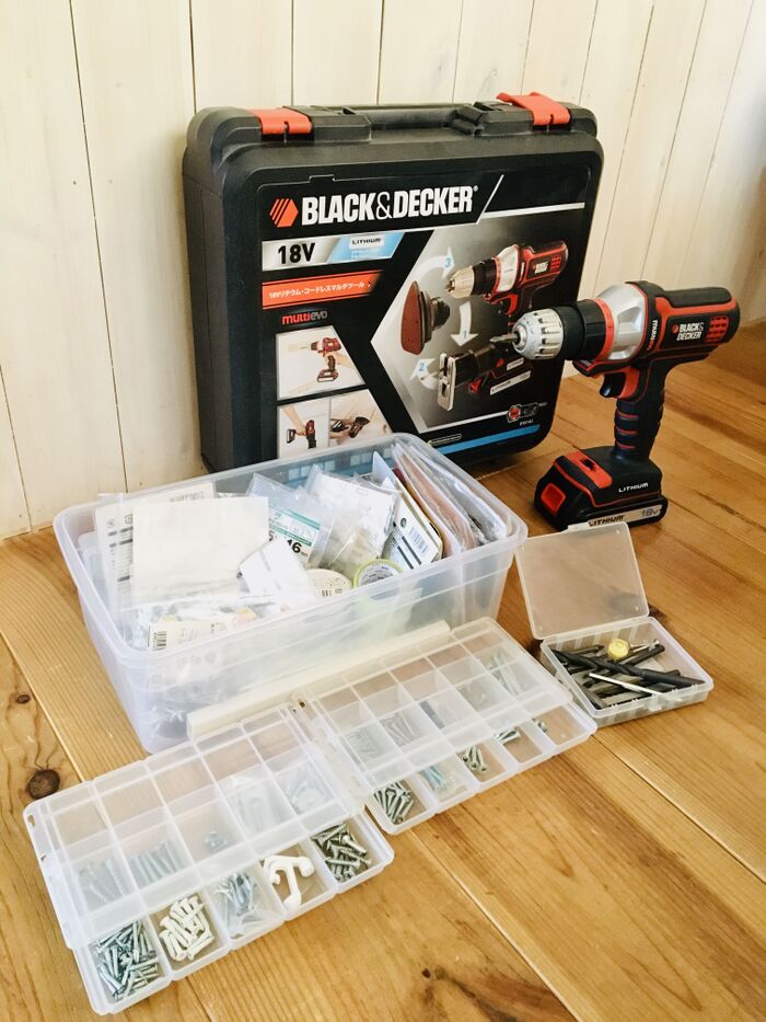 ↑ブラック&デッカーの電動ドライバーを愛用。普段はケースに入れて、子供部屋の2段ベッドの下にしまっています。ビスは100均のプラスチックケースに仕分けて使いやすく。